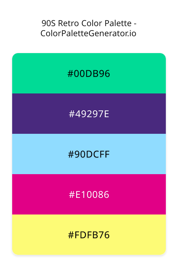 The 90S Retro color palette is a vibrant and bold collection of hues that instantly transport you back to a bygone era of grunge music, high-waisted jeans, and old school video games. This palette is not just a nostalgic trip, but a carefully crafted blend of colors that evoke feelings of playfulness, elegance, and energy. At its core, the 90S Retro palette is all about embracing the carefree spirit of the decade, and its colors work together in perfect harmony to create a visual experience that is both modern and retro at the same time.