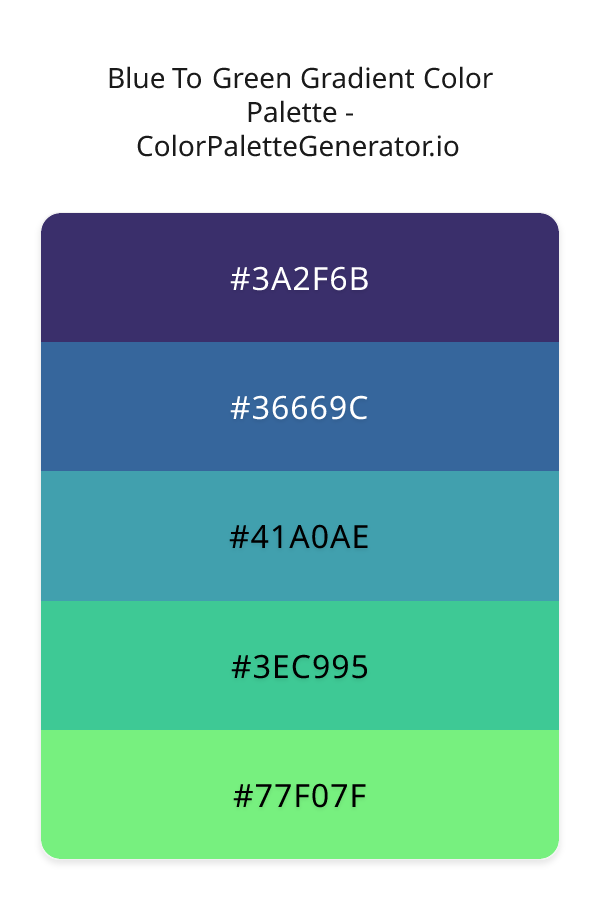 The Blue To Green Gradient color palette is a mesmerizing blend of cool, calming hues that evoke a sense of serenity and growth, inviting the viewer to embark on a journey of discovery and exploration. This harmonious palette weaves together a range of blues and greens, from the deep, rich tones of 3A2F6B, a mysterious indigo shade that sets the foundation for the palette, to the vibrant, energetic notes of 77F07F, a lively green that adds a burst of freshness and vitality to the overall scheme. As the eye travels through the palette, it is drawn to the soothing, gentle quality of 36669C, a soft blue that adds a sense of balance and stability, while 41A0AE and 3EC995 introduce tantalizing hints of turquoise and teal, their aquatic undertones conjuring up images of crystal-clear waters and lush, tropical landscapes.