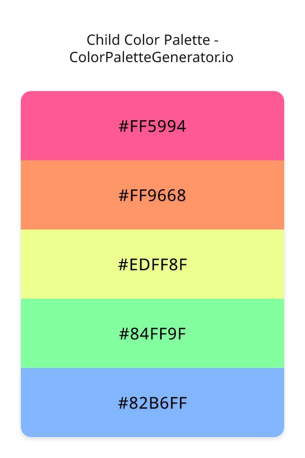 Delving deeper into the individual colors that make up the Child palette, we find a range of unique shades that work together in harmony to create a truly dynamic visual experience. The deep pink tone of FF5994 adds a touch of sophistication and elegance, while the vibrant orange hue of FF9668 injects a sense of energy and excitement. The soft yellow shade of EDFF8F provides a calming influence, balancing out the more intense colors in the palette, and the pale green tone of 84FF9F adds a sense of freshness and growth. Finally, the sky blue shade of 82B6FF rounds out the palette, bringing a sense of tranquility and serenity to the overall design.