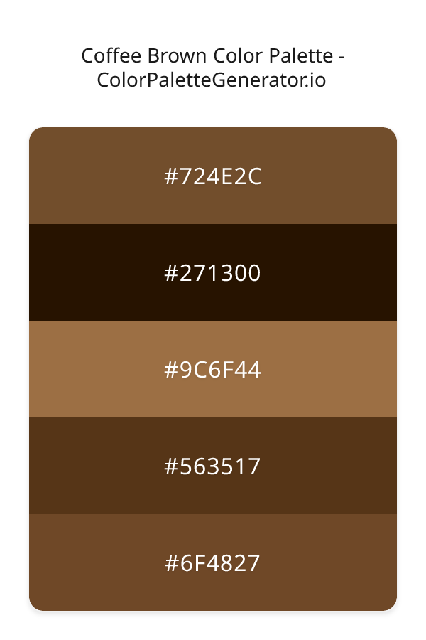 The Coffee Brown palette is a rich and evocative color scheme that evokes the warmth and comfort of a perfectly brewed cup of coffee. This monochromatic palette is characterized by a range of earthy tones, from the deep, cool brown of the 271300 shade, which provides a sense of stability and grounding, to the lighter, more golden hues of the 9C6F44 and 6F4827 shades, which add a sense of warmth and vitality. The overall effect is a balanced and harmonious palette that feels both vintage and timeless, like a well-loved leather armchair or a crackling fire on a cold winter's night.