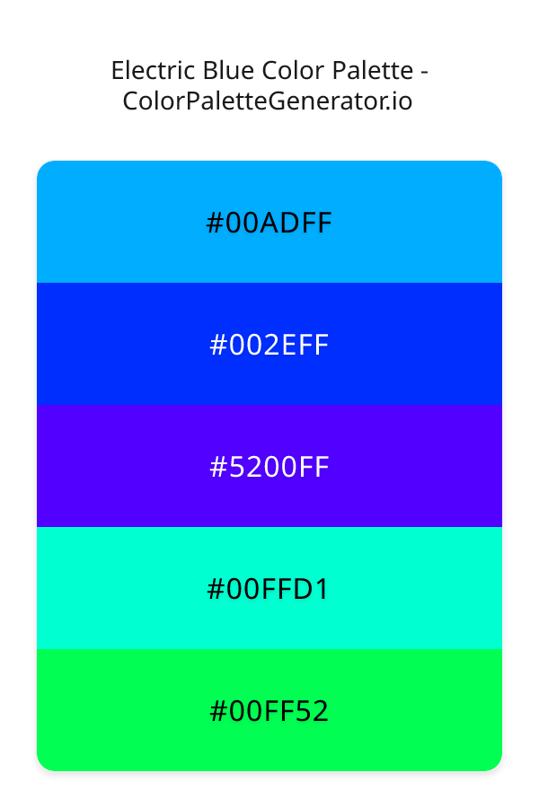 The Electric Blue color palette is a dynamic and captivating combination of vibrant hues that evoke a sense of energy and modernity, perfect for designers and developers looking to make a statement with their work. At its core, this palette is all about creating an emotional impact, drawing the viewer in with its bold and energetic tones that blend seamlessly together to create a truly unique visual experience. The palette's ability to convey a sense of excitement and dynamism makes it an ideal choice for creative professionals working on projects that require a fresh and innovative approach.
