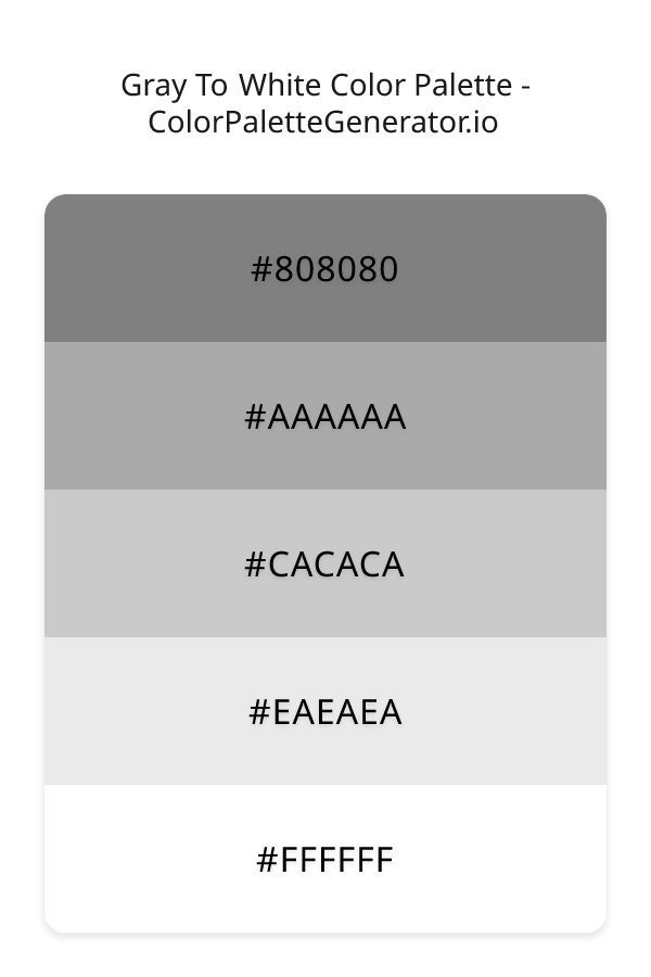 The Gray To White color palette is a masterful blend of soothing hues that evoke a sense of serenity and calmness, perfect for designs that require a gentle and uplifting tone. This monochromatic palette features a range of soft grays that gradually transition into a pure white, creating a sense of depth and visual interest. At its core, the palette is comprised of five distinct shades, including a deep charcoal gray, represented by the hex code 808080, which provides a sense of stability and balance. As the palette progresses, it lightens to a medium gray, embodied by the hex code AAAAAA, which adds a touch of sophistication and versatility.
