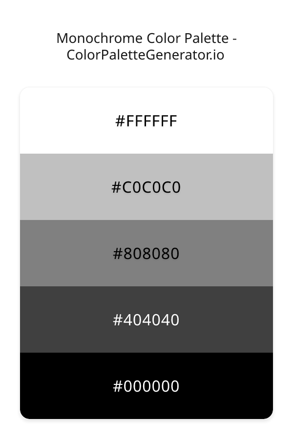 The Monochrome color palette is a masterful blend of contrasting shades that evoke a sense of serenity and sophistication, perfect for designers seeking to create a dramatic visual impact. At its core, this palette is built around varying degrees of gray, from the pure white of white to the deep, mysterious black, with a range of intermediate tones that add depth and nuance to any design. The overall effect is one of understated elegance, as if the colors are working in harmony to create a sense of balance and composure. Despite the absence of bright hues, the Monochrome palette is remarkably versatile, lending itself to a wide range of applications and design styles, from warm and muted to bold and modern.