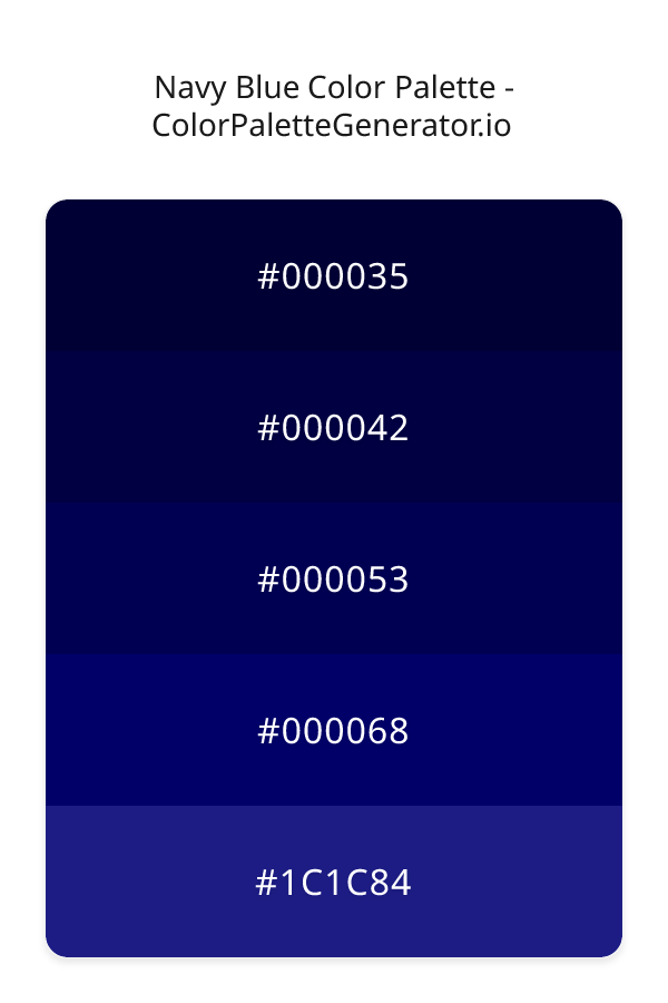 The Navy Blue color palette is a masterful blend of deep, rich blues that evoke a sense of sophistication and elegance, perfect for designs that require a sense of drama and luxury. At its core, this palette is designed to inspire feelings of trust, loyalty, and wisdom, making it an ideal choice for designs that aim to convey a sense of professionalism and expertise. The darkest shade, a deep, almost black blue with the hex code 000035, sets the tone for the entire palette, providing a sense of grounding and stability that underpins the entire design.