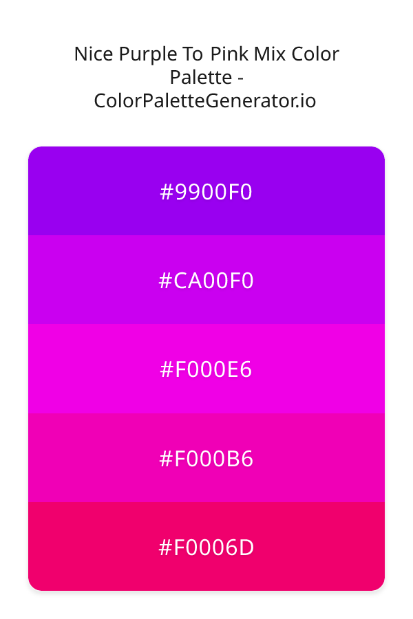 The Nice Purple To Pink Mix color palette is a captivating and dynamic collection of hues that evoke a sense of excitement and energy. At its core, this palette is a masterful blend of rich, bold colors that seamlessly transition from deep purples to vibrant pinks, creating a truly unique and eye-catching visual experience. As the colors graduate from the intense, velvety tone of 9900F0 to the softer, more feminine shades of F0006D, the palette exudes a sense of modernity and sophistication, perfect for designers looking to make a statement.
