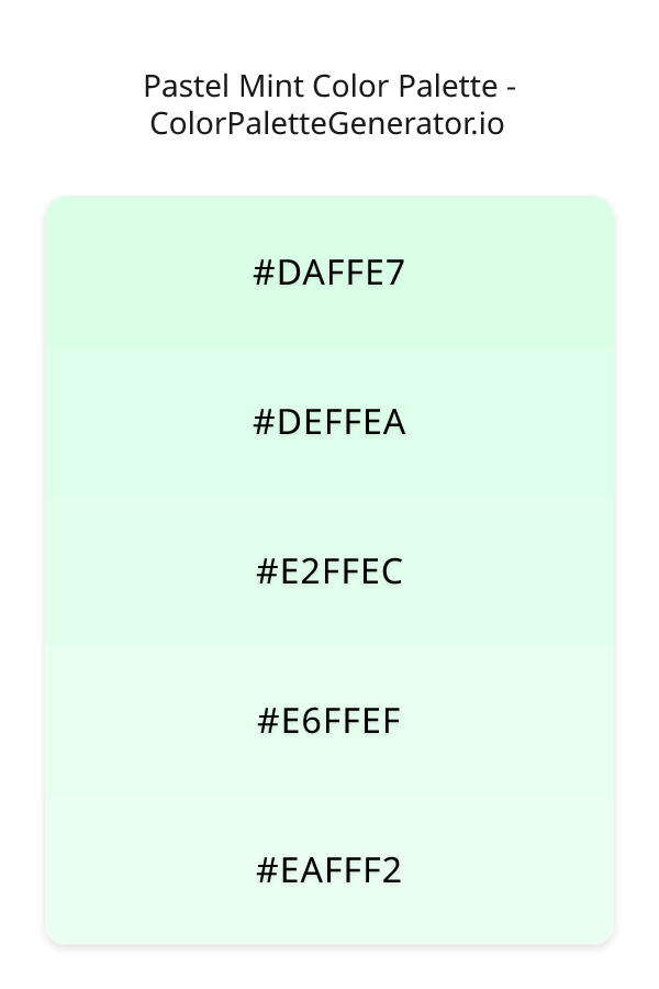 At the heart of the Pastel Mint palette are five carefully curated colors that work together in perfect harmony. The lightest shade, DAFFE7, is a pale, serene hue that sets the tone for the entire palette, providing a clean and airy feel that is both calming and uplifting. DEFFEA is a slightly deeper, more saturated version of the first shade, adding a touch of warmth and coziness to the palette. E2FFEC is a beautiful, soft mint shade that adds a hint of vibrancy and playfulness, while E6FFEF introduces a slightly cooler, more muted tone that helps to balance out the palette. Finally, EAFFF2 is the deepest, richest shade of the group, with a subtle, bold quality that adds depth and visual interest to the design.