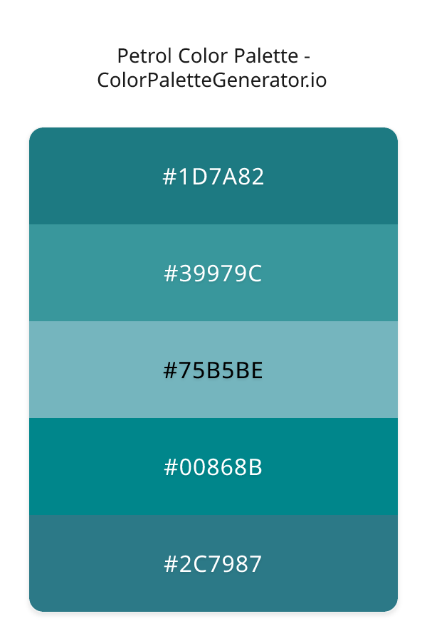 The Petrol color palette is a mesmerizing blend of teal and turquoise hues that evoke the sensation of a serene oceanic landscape. This soothing collection of colors has a profound emotional impact, transporting viewers to a state of calmness and tranquility. As the palette's name suggests, it has a distinct vintage feel, reminiscent of classic coastal scenery, which can add a touch of nostalgia to any design. The Petrol palette consists of five carefully selected colors, each with its own unique shade and role in creating a harmonious visual experience.