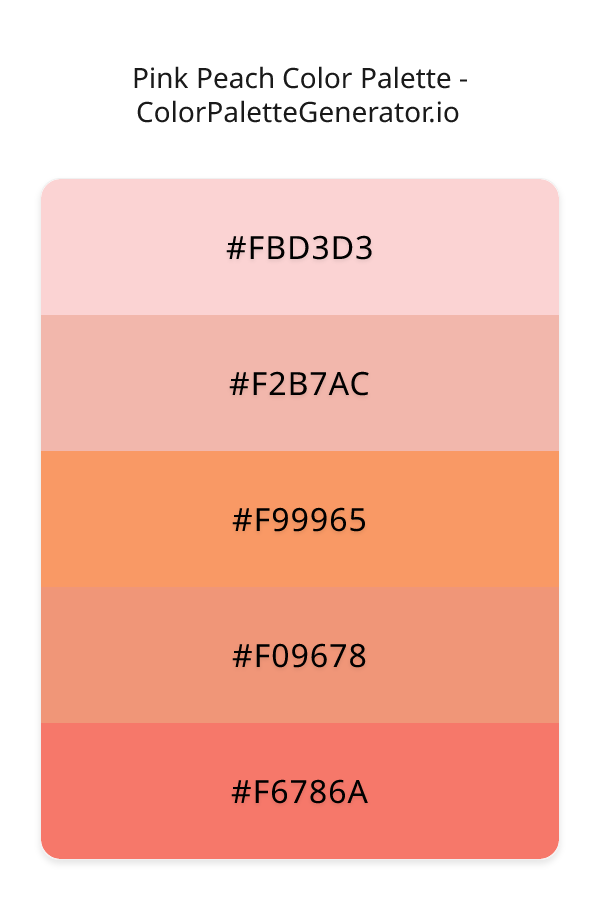 Each color in the Pink Peach palette plays a unique role in creating this captivating visual experience. The soft FBD3D3 provides a gentle foundation, setting the tone for the rest of the palette. As the eye moves through the palette, it encounters the slightly warmer F2B7AC, which adds a touch of sophistication and elegance. The F99965 introduces a hint of vibrancy, injecting a sense of playfulness and energy into the design. The F09678 and F6786A, with their increasing saturation and depth, create a sense of progression and movement, guiding the viewer through the composition. Together, these colors create a cohesive and engaging visual narrative that is both soothing and stimulating.