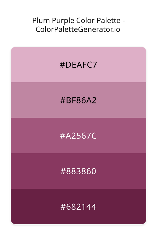 The Plum Purple color palette is a masterful blend of rich, velvety hues that evoke a sense of luxury and sophistication, perfect for designs that aim to convey elegance and refinement. At its core, this palette is a harmonious progression of plum-inspired shades, ranging from the soft, gentle tone of deafc7 to the deep, bold richness of 682144, with each color working in tandem to create a sense of depth and visual interest. As the colors unfold, they reveal a nuanced narrative of warmth and femininity, making this palette an ideal choice for designs that cater to a discerning, fashion-conscious audience.