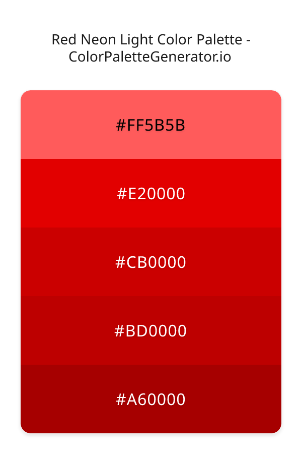 In practical terms, the Red Neon Light palette is an excellent choice for a wide range of design applications, from websites and apps to branding and marketing materials. Its modern, energetic vibe makes it particularly well-suited for projects aimed at a younger demographic, such as entertainment, gaming, or lifestyle brands. Additionally, the palette's bold, attention-grabbing quality makes it ideal for use in call-to-action buttons, notifications, or other interactive elements where designers want to encourage user engagement. Whether used in its entirety or as a starting point for further experimentation, the Red Neon Light palette is sure to add a shot of adrenaline to any design project.