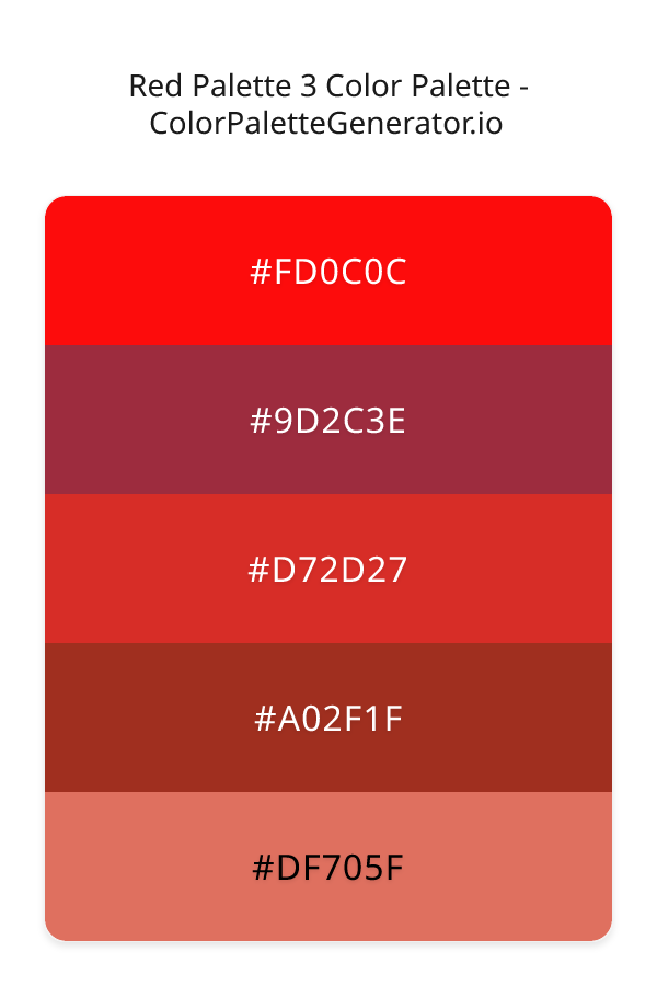 The Red Palette 3 is a vibrant and captivating color scheme that evokes feelings of passion, energy, and warmth. At its core, this palette is a masterful blend of rich, bold hues that converge to create a sense of modern elegance, reminiscent of a breathtaking sunset. The palette's monochromatic approach, featuring a range of red shades, from the deepest maroon to the brightest fire engine red, creates a sense of cohesion and visual harmony. The colors in this palette, including the deep, cool tone of 9D2C3E, the bright, fiery FD0C0C, the warm, inviting D72D27, the earthy, rustic A02F1F, and the soft, pastel DF705F, work together to create a truly immersive visual experience.