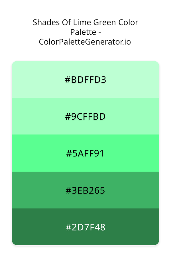 The Shades Of Lime Green color palette is an electrifying combination of hues that evoke feelings of freshness, vitality, and playfulness, making it perfect for projects that require a modern and energetic vibe. This monochromatic palette, which includes a range of shades from the soft and calming bdffd3 to the deep and rich 2d7f48, is sure to capture the attention of viewers and leave a lasting impression. As a vibrant and bold color scheme, it is ideal for designers looking to add a burst of energy to their designs, whether it be for a website, app, or branding project.