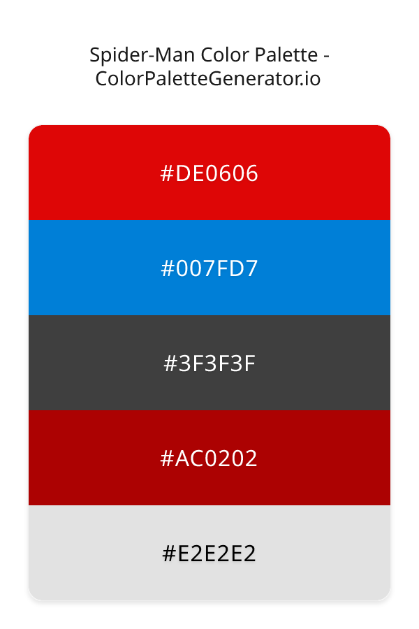 Delving deeper into the palette, we find a range of distinct shades that work together in harmony to create a truly eye-catching visual experience. The deep red tone of DE0606 adds a sense of passion and energy, while the cool blue of 007FD7 provides a sense of calmness and serenity, balancing out the warmth of the red. The dark grey tone of 3F3F3F serves as a neutral background, allowing the other colors to take center stage, and the rich maroon of AC0202 adds a sense of sophistication and luxury. Meanwhile, the light grey tone of E2E2E2 helps to soften the overall look, preventing the palette from feeling too overwhelming or bold. This thoughtful combination of colors is what gives the Spider-Man palette its unique charm, making it perfect for designs that require a sense of balance and contrast.