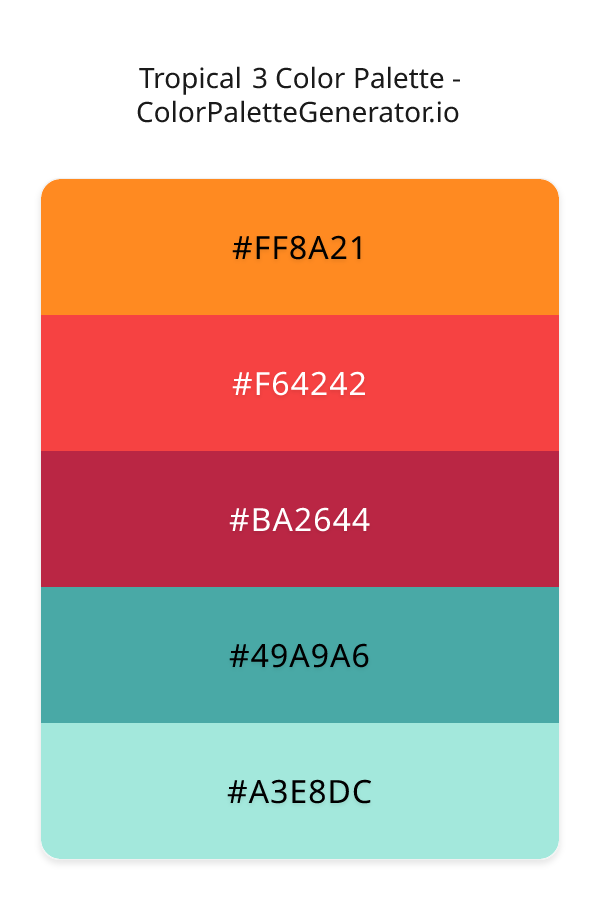 The Tropical 3 color palette is a vibrant and captivating combination of hues that evokes the feeling of a lush, exotic getaway. At its core, this palette is all about embracing warmth and energy, with a unique blend of colors that can add a sense of excitement and playfulness to any design project. As the name suggests, the Tropical 3 palette is perfect for designers looking to create a fun and inviting atmosphere, whether it's for a website, app, or branding campaign.