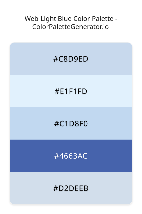 Delving deeper into the individual colors that make up this palette, we find that e1f1fd is a slightly lighter and more pale version of c8d9ed, adding a touch of airiness and subtlety to the design. c1d8f0, on the other hand, is a slightly darker and more saturated shade, providing a sense of depth and contrast to the palette. The introduction of 4663ac adds a sense of sophistication and elegance, as this rich blue hue brings a sense of balance and harmony to the design. Finally, d2deeb serves as a bridge between the lighter and darker shades, tying the entire palette together with its soft and gentle tone. Each of these colors plays a vital role in creating a sense of cohesion and balance, making the Web Light Blue palette a versatile and effective tool for designers.